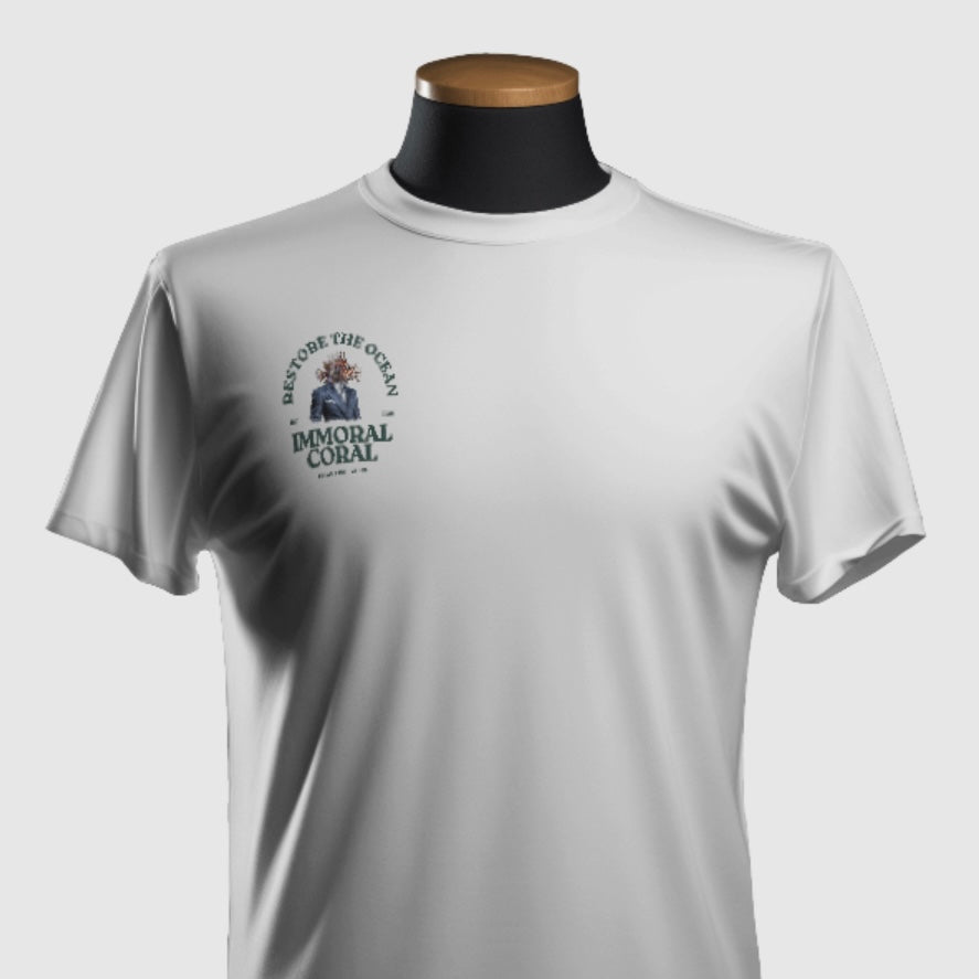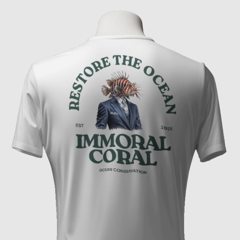 Restore the Ocean – Where bold design meets a bold message. Featuring Larry the Lionfish, Florida’s notorious playboy and most-wanted reef wrecking culprit, suited up and ready to charm — or cause chaos. This tee captures the spirit of Immoral Coral, our call to action to bring life back to the reefs while exposing the villains lurking beneath the waves.